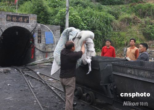 搶險隊員準備搶險物質(zhì)到發(fā)生煤與瓦斯突出事故的漣源市安平鎮(zhèn)新橋煤礦進行搶救。中新社發(fā) 郭國權(quán) 攝