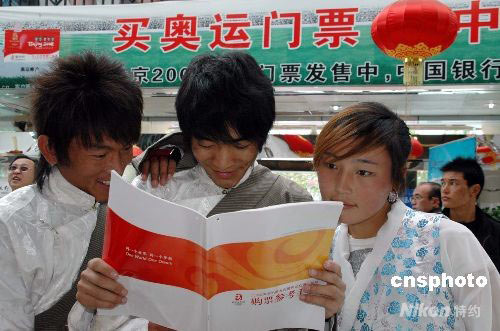 5月5日上午,北京奧運(yùn)會(huì)第三階段門票開始在拉薩銷售,該銷售工作與全國同步進(jìn)行。奧運(yùn)會(huì)門票的銷售,引起了拉薩市民的極大熱情。在西藏奧運(yùn)會(huì)門票銷售點(diǎn)的中國銀行西藏自治區(qū)分行里,購買奧運(yùn)會(huì)門票的市民排起了長長的隊(duì)伍。圖為西藏大學(xué)的學(xué)生在看購票參考手冊(cè)。 中新社發(fā) 周波 攝