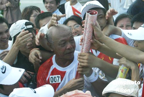 鄭文泰作為第一棒火炬手,其傳遞結(jié)束后,數(shù)百名農(nóng)場歸僑競相觸摸其手中的火炬。