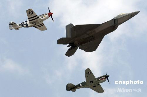 當(dāng)?shù)貢r間5月4日,一架美軍最先進(jìn)的F-22猛禽戰(zhàn)機(jī)(中)與二戰(zhàn)時期的美軍戰(zhàn)機(jī)P-51和P-40空中共舞,讓人們體驗(yàn)航空科技的突飛猛進(jìn)。當(dāng)天,位于美國南加州河濱縣的一個美國空軍預(yù)備基地舉行規(guī)模盛大的航空展和飛行表演。C-17A全球霸王運(yùn)輸機(jī)、C-5銀河運(yùn)輸機(jī)等空中巨無霸和F-22猛禽戰(zhàn)機(jī)等美軍先進(jìn)軍用飛機(jī)亮相展覽,F(xiàn)-22戰(zhàn)機(jī)飛行表演、美國空軍“雷鳥”飛行隊(duì)的特技表演等令近十萬民眾大飽眼福。中新社發(fā) 張煒 攝