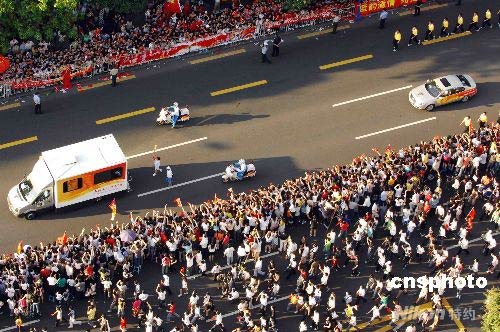 奧運(yùn)火炬經(jīng)過(guò)市區(qū)深南大道受到兩旁市民熱情追逐。 中新社發(fā) 陳文 攝