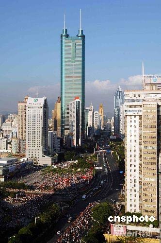 圖為火炬?zhèn)鬟f隊伍途經(jīng)深圳標志建筑地王大廈。中新社發(fā) 陳文 攝
