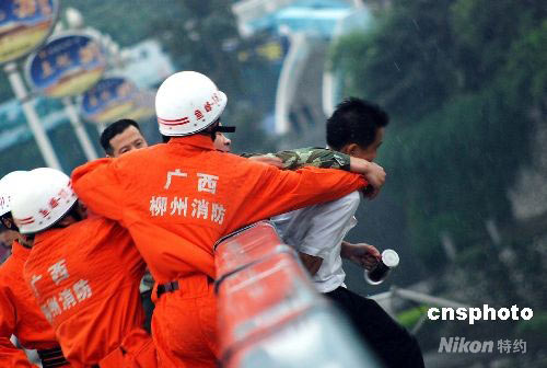 5月9日,廣西柳州市一名男子站在柳江大橋上,企圖跳橋輕生,消防戰(zhàn)士在勸導男子的過程中,趁其不備,將其救下,整個過程不到10分鐘。中新社發(fā) 小木木 攝