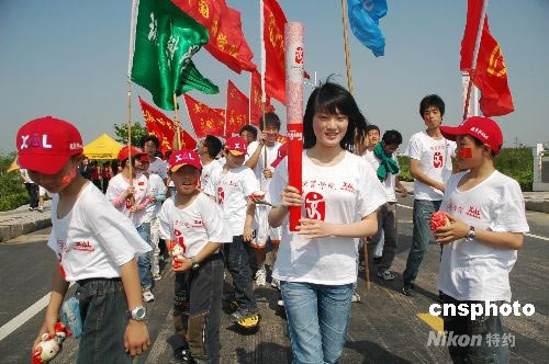 5月10日,模擬火炬?zhèn)鬟f途中。當天,安徽師范大學(xué)舉辦“奧運心,中華情”模擬奧運火炬?zhèn)鬟f活動,主辦方邀請了學(xué)生、教師、老人、殘疾人等30人組成火炬手,體驗奧運火炬手的光榮與快樂,表達對北京奧運會的美好祝福。 中新社發(fā) 閔澤未 攝