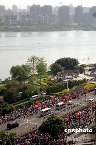 5月11日下午,北京奧運(yùn)火炬在福州最美的江濱大道進(jìn)行傳遞,現(xiàn)場(chǎng)盛況空前。 中新社發(fā) 王東明 攝