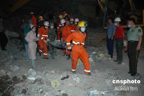 12日下午2:30左右,受四川汶川地震波及,重慶市梁平縣文化鎮(zhèn)一小學(xué)教學(xué)樓發(fā)生垮塌。13日凌晨1時許,搜救工作已全部結(jié)束,垮塌造成5人死亡,36人受傷。圖為消防將剛搜救出一名傷者。 中新社發(fā) 郭虹 攝