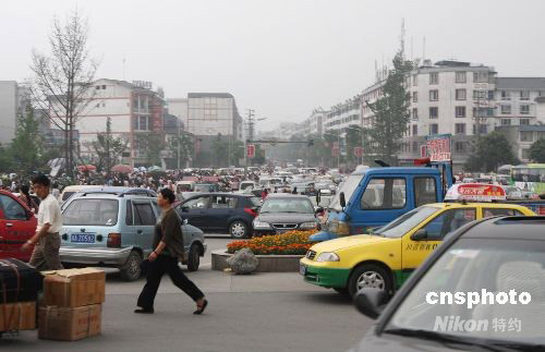 5月12日14時28分,四川汶川縣(北緯31度,東經(jīng)103.4度)發(fā)生7.8級地震。圖為受災(zāi)嚴(yán)重的都江堰市區(qū)居民紛紛出來避險,造成車輛堵塞。中新社發(fā) 黃榮 攝