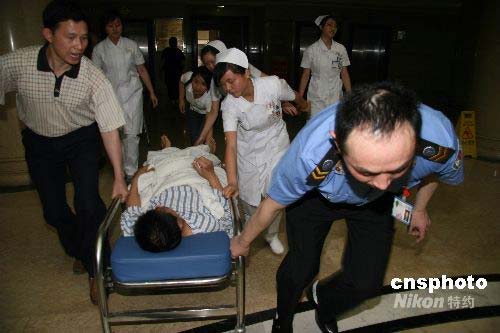 5月12日下午,四川汶川發(fā)生7.8級(jí)地震,地震后,四川省人民醫(yī)院醫(yī)生、護(hù)士迅速轉(zhuǎn)移患者到安全地帶。中新社發(fā) 黃家明 攝