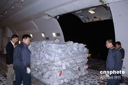 5月14日凌晨,深航旗下中德合資翡翠航空大型貨機(jī)JI7452航班滿(mǎn)載四千頂救災(zāi)帳篷,從天津?yàn)I海機(jī)場(chǎng)裝機(jī)運(yùn)往四川地震災(zāi)區(qū)。中新社發(fā) 陳文 攝