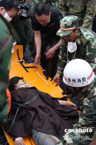 5月14日,在四川什邡市鎣華鎮(zhèn)救災的武警鄭州消防支隊100多名官兵,用7個小時救出一名被廢墟掩埋了3天的工人。