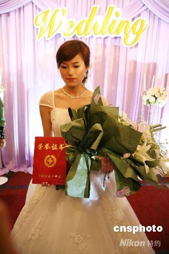 5月16日晚,在南京金陵飯店鐘山廳舉行了一場特殊的婚禮。當身披婚紗的新娘踏上紅毯時,應(yīng)該站在紅毯另一端的新郎--南京空軍某部飛行員饒新,卻正在千里之外的四川災(zāi)區(qū)執(zhí)行救援任務(wù)。這場只有新娘出席的婚禮感動了整個南京城。中新社發(fā) 鐘山 攝