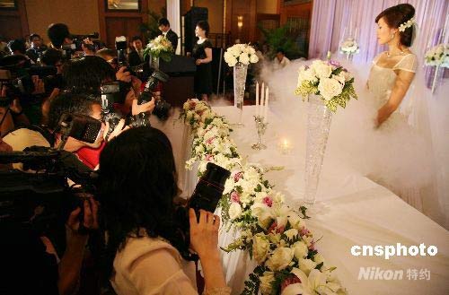 新娘邱媛媛獨(dú)自一人出現(xiàn)在婚禮現(xiàn)場。 中新社發(fā) 鐘山 攝