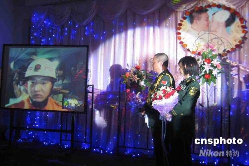 遼寧省遼陽市白塔消防大隊鐵西中隊副中隊長郎猛赴四川抗震救災,他與陜西省寶雞市扶風消防大隊副指導員常芳的婚禮如期舉行。5月17日,新娘常芳在郎猛的家鄉(xiāng)遼寧省新民市舉行了一場特殊的婚禮。中新社發(fā) 沈殿成 攝