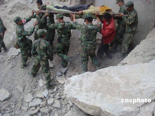 5月18日,成都軍區(qū)駐渝某集團軍紅軍師步兵團在汶川大地震茂縣懸崖峭壁的羌寨,冒著余震塌方解救兩位女傷員,傍晚成功送到前來支援的解放軍第二軍醫(yī)大學醫(yī)療隊。中新社發(fā) 賈國榮 攝