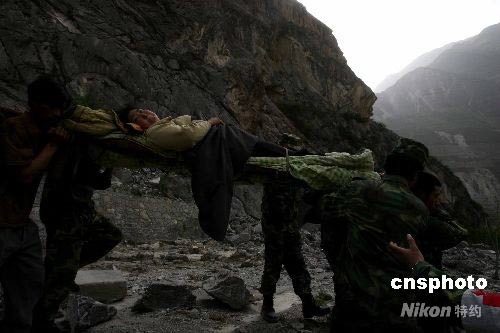 成都軍區(qū)駐渝某集團(tuán)軍紅軍師步兵團(tuán)翻山越嶺解救汶川大地震茂縣羌寨兩位女傷員,傍晚成功送到前來支援的解放軍第二軍醫(yī)大學(xué)醫(yī)療隊。中新社發(fā) 賈國榮 攝