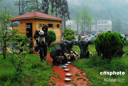 四川發(fā)生大地震后,臥龍保護區(qū)管理局的職工于第一時間將大熊貓轉移到安全地帶。在此次地震中,臥龍保護區(qū)管理局的房舍嚴重受損,其中32套大熊貓圈舍中有14套全部損毀,其余嚴重受損。據(jù)悉,工作人員目前正在尋找二到三只下落不明的大熊貓,其余所有熊貓被集中飼養(yǎng)在簡單修復的圈舍中,但圈舍比較擁擠。國家林業(yè)局和四川省林業(yè)廳已緊急調(diào)撥熊貓食品、藥品,以及保護區(qū)內(nèi)職工急需的帳篷等救援物資,現(xiàn)已繞道送至臥龍自然保護區(qū)。中新社發(fā) 臥龍 攝