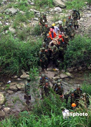 16日上午,師政治部主任高鵬帶領(lǐng)救援突擊隊和醫(yī)療小分隊172人,從綿竹市漢旺鎮(zhèn)出發(fā)向重災(zāi)區(qū)天池鄉(xiāng)幾個村里運送救援物資,幫助群眾撤離震區(qū)。11時左右,當(dāng)部隊行至高橋以西500米處,突然發(fā)生余震,導(dǎo)致大量山石從山頂傾斜而下,直接威脅著正在這個路段通過的群眾。作訓(xùn)參謀祝紅杰突然發(fā)現(xiàn)一個孩子癱倒在石堆上,急忙上前搶抱他,孩子得救了,祝紅杰卻被亂石砸斷左腿,當(dāng)場倒地。作訓(xùn)參謀胡國才眼見一塊亂石砸向老人,極力將老人推到一邊,自己的頭部卻被亂石砸傷暈倒在地。同時,該團(tuán)還有一名司務(wù)長和兩名戰(zhàn)士在救援中被泥石流砸傷…… 看到解放軍為救災(zāi)區(qū)群眾身負(fù)重傷,在現(xiàn)場的一些救災(zāi)志愿者迅即投入搶救部隊官兵的行動中。運送途中山路險峻,他們拉一把、推一把,爭先恐后出把力氣。擔(dān)負(fù)救援撤離群眾任務(wù)的重慶市高新區(qū)人民醫(yī)院的醫(yī)護(hù)人員聞訊后,一邊流著熱淚,一邊實施現(xiàn)場救護(hù),為他們贏得了寶貴的救治時機(jī)……