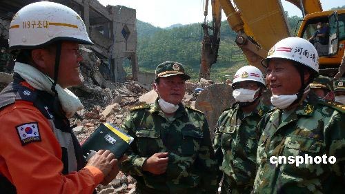 5月19日,中韓兩國(guó)救援隊(duì)員四川什邡鎣華鎮(zhèn)一處樓房廢墟上,聯(lián)手搜救被困者。中新社發(fā) 張曉理 攝