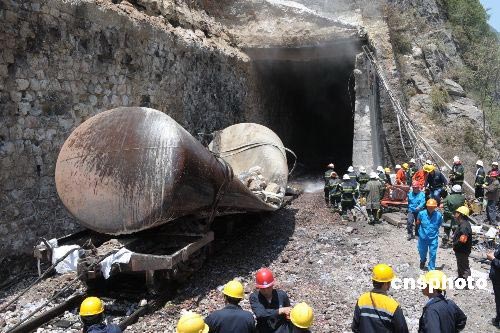 5月20日,寶成鐵路109號(hào)隧道搶險(xiǎn)工作取得重大進(jìn)展,隧道南口已拖出全部12節(jié)油罐車(chē)中的最后一節(jié)。截至當(dāng)日下午15時(shí),隧道南口已拖出14節(jié)受損車(chē)輛,其中包括全部12節(jié)油罐車(chē),隧道北口拖出8節(jié)車(chē)輛。至此,109號(hào)隧道內(nèi)僅剩下18輛車(chē)未拖出。中新社發(fā) 唐振江 攝