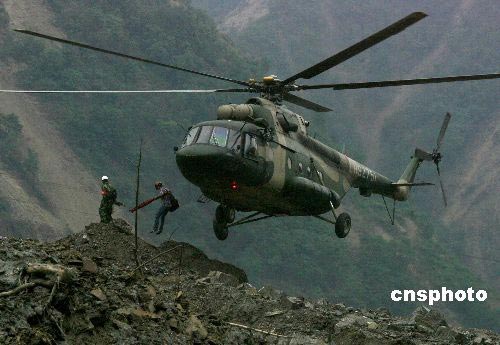 五月二十日上午十時,成都軍區(qū)陸航團姜廣偉王牌直升機組成功強降北川重災(zāi)區(qū)“定時炸彈”--堰塞湖無名塌方小土堆上,水利地質(zhì)技術(shù)人員緊急跳下飛機,投入實地監(jiān)測水位。 中新社發(fā) 賈國榮 攝