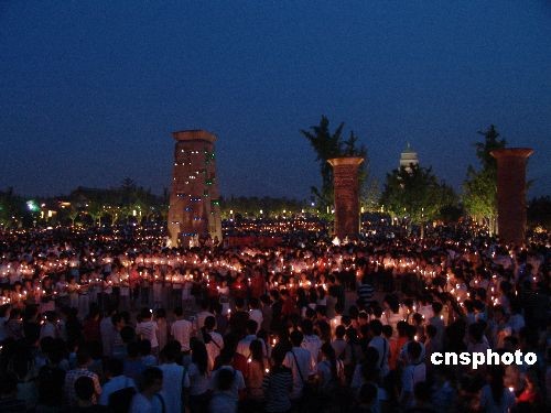 2008年5月19日晚,在西安大雁塔北廣場,上萬市民手持蠟燭自發(fā)為在汶川大地震中遇難的同胞們致哀。