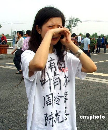 綿陽市抗震救災(zāi)最大的救助點(diǎn)九州體育館容納了2萬多名來自北川、安縣等地的災(zāi)民, 5月15日上午,北川地震災(zāi)民家屬葉婷焦急地尋找親人。 霍潺 攝