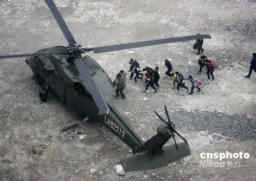 一批震中區(qū)的男女老少正緊急登上成都軍區(qū)陸航團(tuán)的救援飛機(jī)前往成都。中新社發(fā) 賈國榮 攝