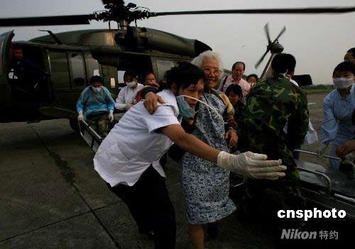 5月16日下午,二十六名境外游客游客從汶川大地震被稱為“孤島”的茂縣登上救援的中國空軍黑鷹直升機,平安撤到四川省會成都。中新社發(fā) 賈國榮 攝