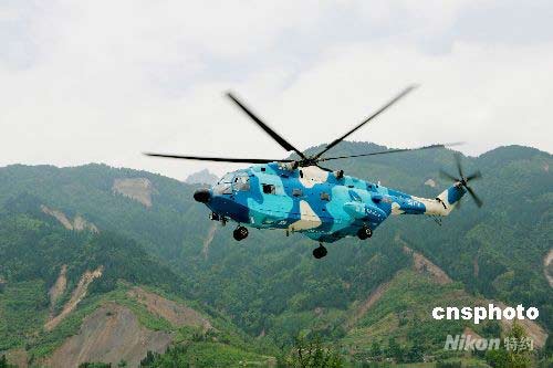 5月19日,南空某搜救團(tuán)直升機(jī)在四川地震災(zāi)區(qū)進(jìn)行搜救工作。中新社發(fā) 賁道春 攝