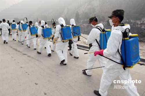 圖:救災(zāi)部隊(duì)在汶川映秀鎮(zhèn)展開消毒防疫