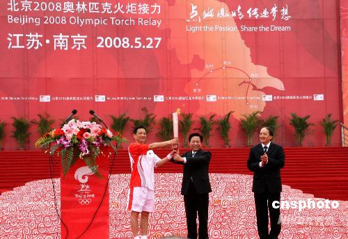 5月27日,奧運(yùn)會(huì)火炬?zhèn)鬟f活動(dòng)來(lái)到江蘇省省會(huì)、六朝古都南京。擔(dān)任南京站傳遞活動(dòng)第一棒火炬手是羽毛球名將楊陽(yáng),早上8點(diǎn)他從江蘇省委書記梁保華手中接過(guò)“祥云”火炬,拉開了南京站傳遞序幕。 中新社發(fā) 崔佳明 攝