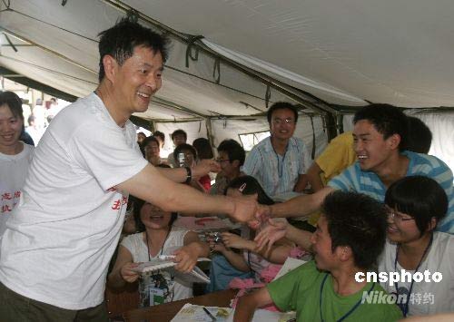 5月26日,濮存昕、林志穎、王寶強等藝人前往地震重災區(qū)什邡市一中學帳篷教室看望復課學生。這些藝人是參與由中國扶貧基金會主辦的“5·12青少年關愛基金——明星義工行動”的第一批明星義工。經(jīng)歷過臺灣9·21大地震的林志穎作為臺灣第一位親赴內(nèi)地參加賑災行動的藝人,認為災區(qū)的小朋友是最需要幫助的人。中新社發(fā) 張曉理 攝