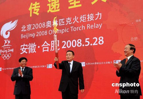 5月28日,奧運(yùn)圣火在安徽合肥傳遞,起跑儀式上中共安徽省委書(shū)記王金山擎起祥云圣火。 中新社發(fā) 廖攀 攝