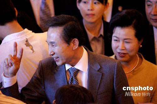 圖為韓國(guó)總統(tǒng)李明博在北京大學(xué)發(fā)表演講后,向?yàn)槠渑恼盏膶W(xué)生們擺POSS。中新社發(fā) 張宇 攝