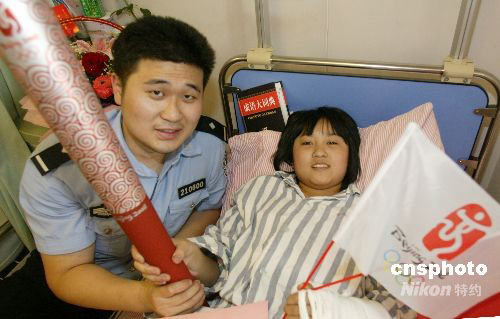 田野,是南京市公安局華僑路派出所的一名民警,也是北京奧運(yùn)會(huì)的火炬手。5月29日,他和他的同事帶著奧運(yùn)火炬來到江蘇省人民醫(yī)院愛心病房,看望6位在四川地震中受災(zāi)的孩子,讓他們近距離的看到了“祥云”火炬,并告訴他們?cè)诨鹁鎮(zhèn)鬟f中大家對(duì)災(zāi)區(qū)的祝愿。中新社發(fā) 吳俊 攝