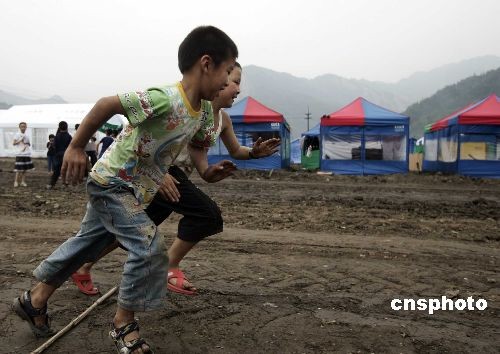 5月30日,四川什邡市紅白鎮(zhèn)地震劫后余生的孩子們在災(zāi)區(qū)居民安置點的空地上賽跑玩耍。中新社發(fā) 杜洋 攝