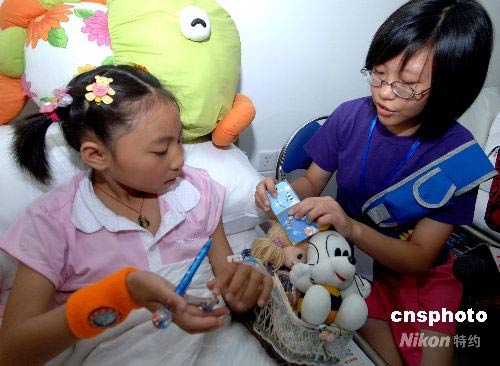 洪儀庭(右)向在此接受治療的四川綿竹11歲的李玉茹送上她精心準(zhǔn)備的節(jié)日禮物。中新社發(fā) 劉可耕 攝