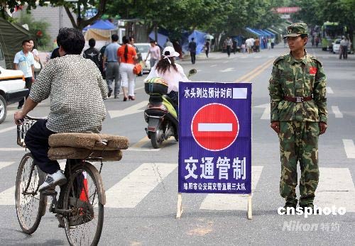 5月31日,唐家山堰塞湖避險(xiǎn)疏散預(yù)案三分之一潰壩方案涉及的下游群眾,已全部撤離到安全地帶。圖為安置疏散民眾的綿陽(yáng)市游仙區(qū)綿山路實(shí)行交通管制。中新社發(fā) 毛建軍 攝