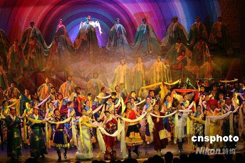 5月31日晚,西藏自治區(qū)文藝界舉行《幸福在路上》主題匯演,此系四川大地震后西藏首場(chǎng)大型演出,雪域兒女以吉祥哈達(dá)祝福祖國(guó)、祝福四川、祝福北京奧運(yùn)會(huì)。中新社發(fā) 賈長(zhǎng)飛 攝
