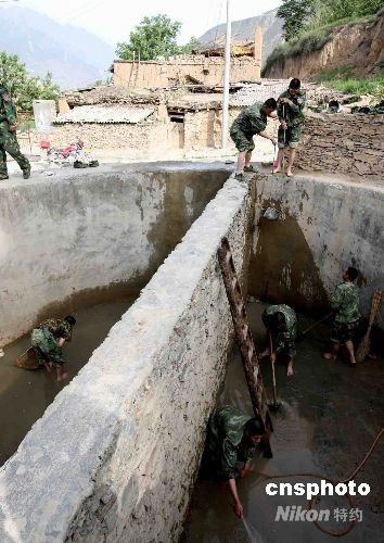 6月2日,參加抗震救災(zāi)的鐵軍官兵在海拔2000多米高的汶川威州鎮(zhèn)布瓦村幫助災(zāi)民清理儲水井。中新社發(fā) 曾憲平 攝