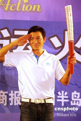6月3日,在海南三亞進(jìn)行的“愛心呵護(hù) 陽光行動(dòng)”愛心大使奧運(yùn)火炬義拍活動(dòng)中,香港藝人劉德華拿出自己在香港傳遞奧運(yùn)圣火時(shí)的奧運(yùn)火炬進(jìn)行現(xiàn)場義拍,拍得人民幣190萬元,拍賣所得將全部用于四川地震災(zāi)區(qū)教育事業(yè)。圖為劉德華在展示自己的奧運(yùn)火炬。中新社發(fā) 尹海明 攝