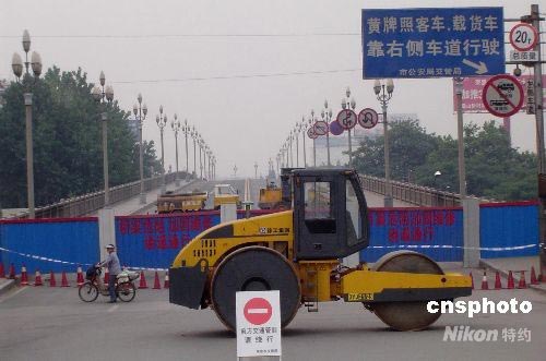6月2日凌晨三時(shí),因小商品攤位發(fā)生火災(zāi)導(dǎo)致南京長(zhǎng)江大橋南引橋第一橋孔嚴(yán)重受損,大橋?qū)嵭薪煌ü苤疲卉?chē)及小型客車(chē)可繞行上橋外,其他車(chē)輛二十四小時(shí)禁止通行。受此影響,當(dāng)日南京碼頭輪渡運(yùn)送過(guò)江乘客達(dá)十萬(wàn)人以上。圖為南京長(zhǎng)江大橋南引橋設(shè)置的禁止交通圍檔。中新社發(fā) 王國(guó)安 攝