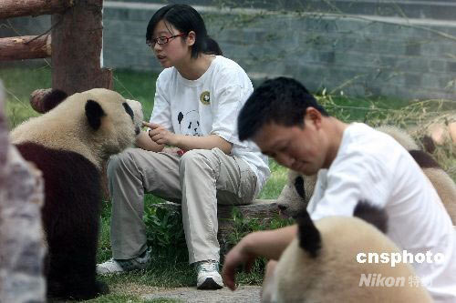 6月5日上午,八只臥龍“奧運(yùn)大熊貓寶寶”在北京動物園的新家中首次公開亮相。這些1歲多的“小國寶”不時需要臥龍來的飼養(yǎng)員用四川鄉(xiāng)音安撫它們在5·12大地震中受到驚嚇的心靈。 中新社發(fā) 任晨鳴 攝