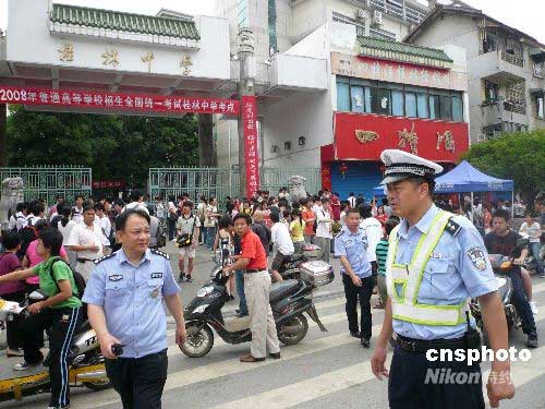 6月7日,全國(guó)高考第一天,桂林中學(xué)高考點(diǎn),交警現(xiàn)場(chǎng)維持秩序。2008年廣西高考報(bào)名人數(shù)30萬(wàn)3778人,首次突破30萬(wàn)人,比2007年增長(zhǎng)3.20%。中新社發(fā) 周利朔 攝
