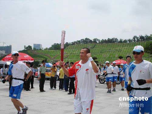 享有“亞洲飛人”美譽的廣西短跑名將陳文忠接過圣火,跑進南寧國際會展中心點燃圣火盆。中新社發(fā) 黃艷梅 攝