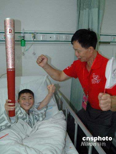 火炬手自發(fā)趕到廣西醫(yī)科大學(xué)附屬醫(yī)院,看望在這里治療的四川地震災(zāi)區(qū)傷員,并讓他們?cè)诓〈采吓c“祥云”親密接觸,了卻看奧運(yùn)圣火傳遞的心愿。中新社發(fā) 蔣雪林 攝