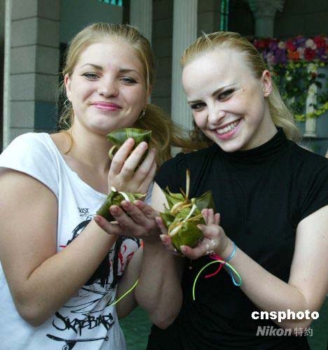 在北京世界公園參加“歌舞匯演”的俄羅斯女演員和同伴展示她們包的粽子。中新社發(fā) 富田 攝