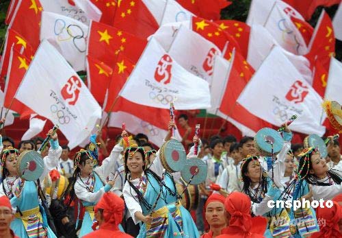 圖:云南各民族群眾歡慶奧運(yùn)圣火傳遞