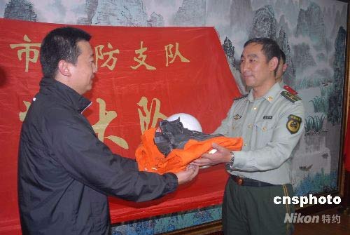 6月9日,中國國家博物館在沈陽消防支隊(duì)舉行了抗震救災(zāi)相關(guān)實(shí)物和資料收藏的交接儀式,四川抗震救災(zāi)中沈陽消防支隊(duì)特勤大隊(duì)隊(duì)旗、大隊(duì)長李忠海的防護(hù)服(含頭盔)和隊(duì)員的戰(zhàn)地日記等成為了中國國家博物館永久性收藏品。這是中國國家博物館首次收藏四川抗震救災(zāi)實(shí)物和資料。在四川抗震救災(zāi)中,沈陽市消防局特勤大隊(duì)是中國第一支進(jìn)入北川縣的救援隊(duì)。中新社發(fā) 沈警 攝