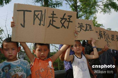 6月9日下午,四川省遂寧市數(shù)千群眾自發(fā)來到烈士陵園公墓,送別遂寧市優(yōu)秀的抗震救災(zāi)英雄丁剛。今年40歲的丁剛,是遂寧市船山區(qū)一名普通居民,6月3日參加遂寧市應(yīng)急民兵營一連突擊隊,赴災(zāi)區(qū)抗震救災(zāi)。5日18時30分許在映秀鎮(zhèn)搜尋失事直升飛機時,遇山體滑坡,為救戰(zhàn)友,被飛石擊中頭部,不幸犧牲。6月9日下午3點30分,遂寧市政府、遂寧軍分區(qū)為丁剛同志舉行遺體告別儀式,以告慰英靈。中新社發(fā) 鐘 敏 攝